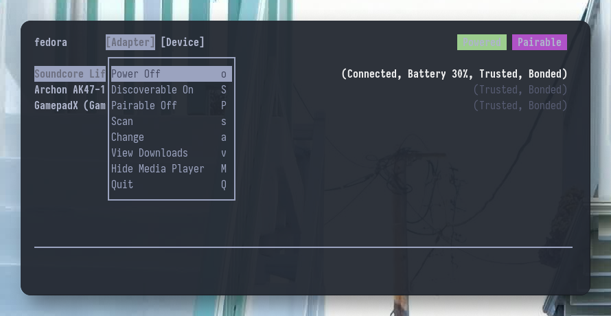 GTK 앱인 Blueman-manager 과 싱크로율이 거의 100%에 가까운 TUI 도구입니다. 마우스를 지원하기 때문에 keymap이 익숙하지 않다면 우선 mouse를 이용하면 쉽습니다. 목록에 표시된 기기에서는 마우스 오른쪽 버튼을 클릭하면 GUI처럼 contexture-menu가 표시됩니다.