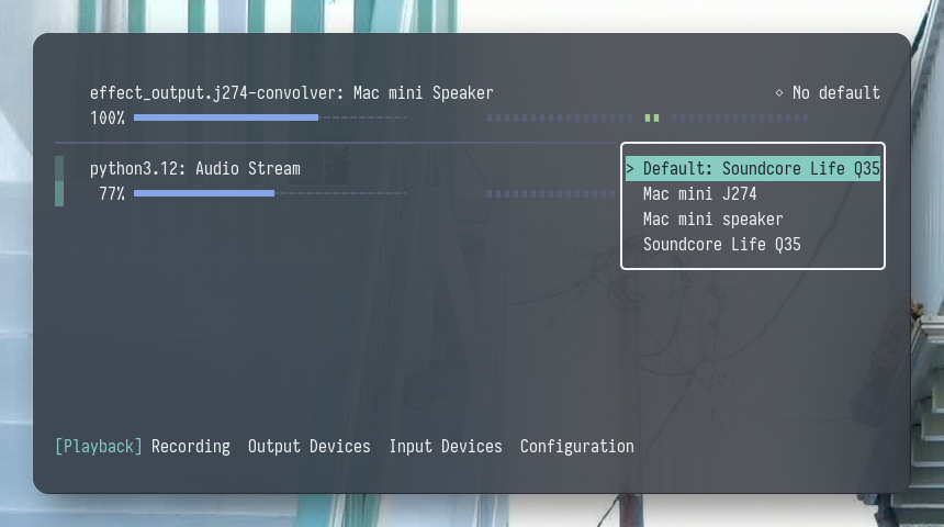 PulseAudio Volume Controller인 pavucontrol 과 거의 동일한 인터페이스를 지원하는 TUI 도구입니다. 역시 mouse를 지원해서 화면 하단의 section 선택 변경이나, 각 node의 볼륨을 직관적으로 변경할 수 있습니다.
