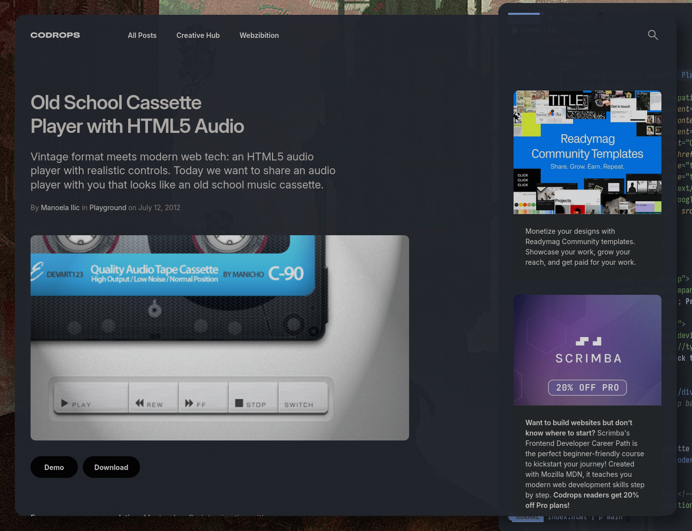 웹 디자인 및 앱 개발 분야의 온라인 리소스 사이트인 Cordrops에 올라온 Old School Cassette Player with HTML5 Audio라는 것으로 HTML, CSS, Javascript로 구현된 Cassette Player 입니다. Demo 사이트에서 그 기능을 확인할 수 있는데요. 일종의 카세트 플레이어 Simulator(시뮬레이터)인 셈입니다. 정말 멋지게 잘 만들어져 있습니다. 개발자분이 존경스럽네요. 관련 기술에 대한 온라인 학습과정을 홍보하기 위한 포트폴리오로 등록한 것 같습니다. 그런데 소스코드까지 다운로드할 수 있지 몹니까.. 와...