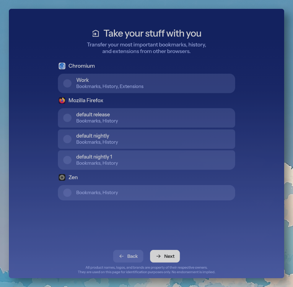 다음 화면은 bookmark, 검색 히스토리, extension을 기존에 사용하던 웹 브라우저여서 Helium으로 transfer할지를 묻는 화면 입니다. 동일한 chromium 기반이라면 bookmarks, history, extensions을 모두 trasfer 받을 수 있고, 다른 웹 엔진을 사용하는 브라우저라면 bookmark 와 history만 transfer 할 수 있습니다. transfer를 원치 않는다면 그냥 NEXT 버튼을 누르면 됩니다. 왠만하면 trasfer하지 않습니다.