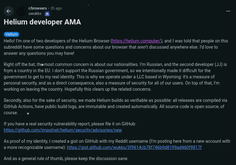 Comminity 전반에 걸친 이러한 신원 불명의 우려에 대해 제작자들도 공감하고 있는 듯 합니다. Reddit에 제작자 중 한 분이 익명으로 활동하고 있는 이유에 대해 설명을 했습니다.
