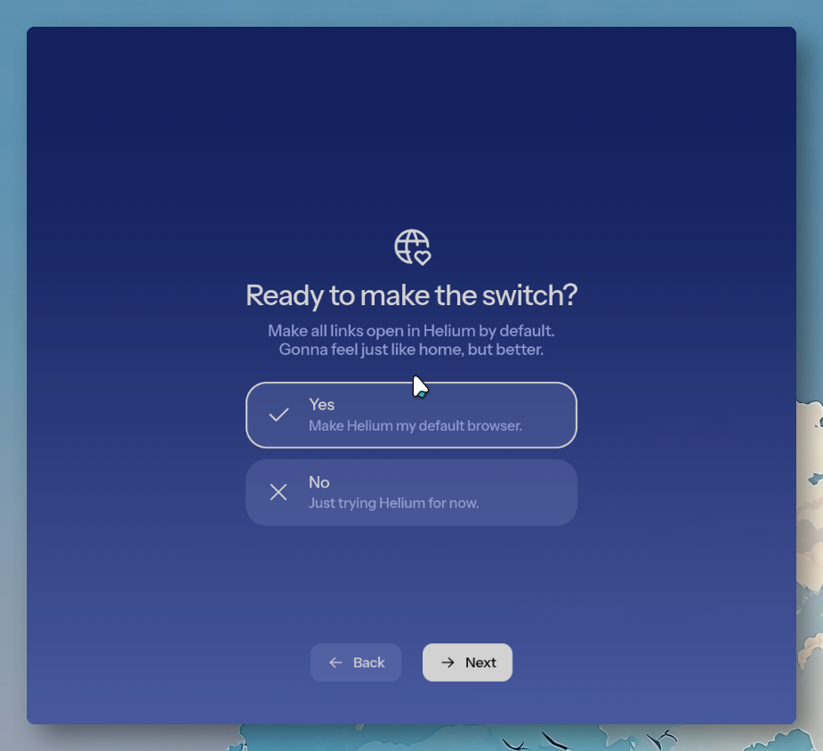 마지막으로 기본(Default) 웹 브라우저로 설정할지의 여부를 묻습니다. 기본 선택이 YES 이므로 원치 않는다면 NO를 선택하고 Next 버튼을 눌러 줍니다.