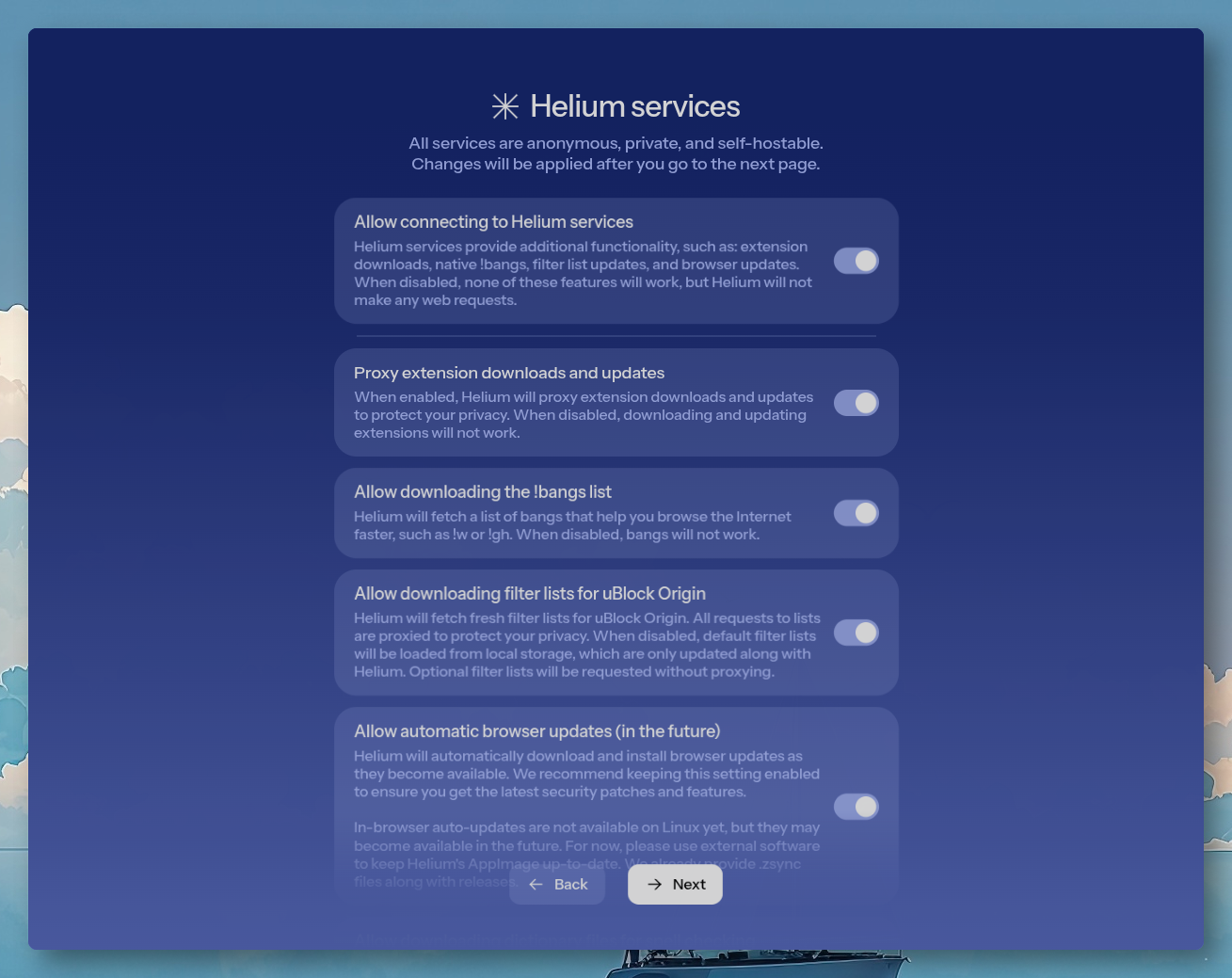 위의 스샷은 Helium을 최초 실행할 때 나타나는 Helium service Option 선택 화면 입니다. 제일 상단의 Allow Cneecting to Helium services 항목을 OFF 시키면 아래 모든 기능들이 모두 OFF 됩니다.