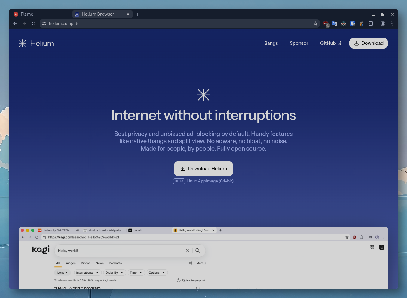 Helium은 UGC(UnGoogled Chromium)을 기반의 프로젝트로 "최고의 개인정보 보호화 편견 없는 광고 차단 기능을 기본으로 제공하며, Split View 기능, ad-ware 및 bloat, noise 없는, 사람에 의한 사람을 위한 완전한 Open Source"를 지향하는 웹 브라우저라고 소개하고 있습니다.