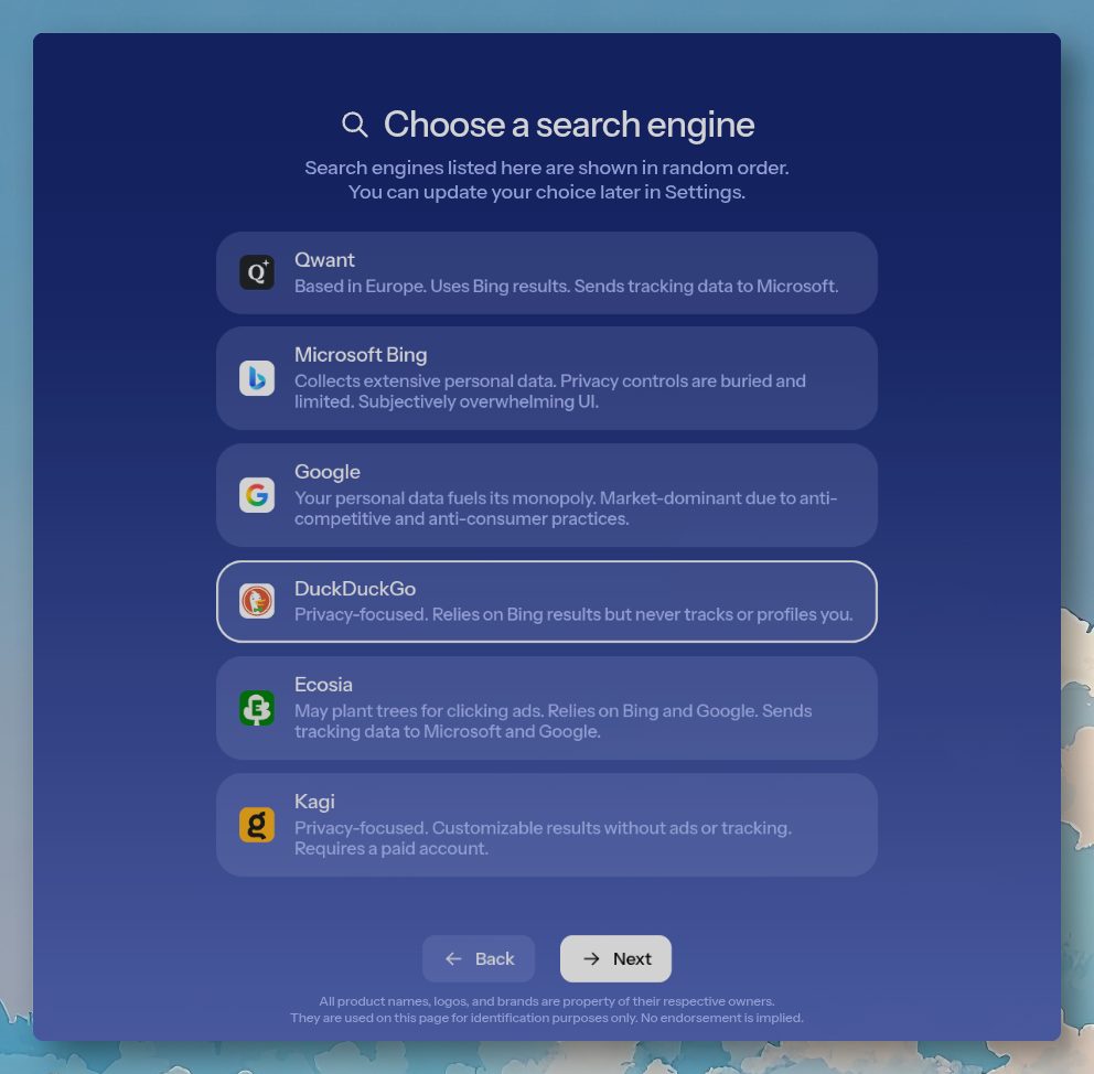 Helium service 옵션에서 다음으로 넘어가면 위의 스샷과 같이 어떤 검색 엔진을 사용할지의 여부를 물어 봅니다. Ungoogle Chromium 에서는 주소창에서 직접 검색을 할 수가 없습니다. 기본적으로는 지원을 하지 않습니다. 물론 설정에서 지원하도록 설정할 수는 있는데, Google 검색은 또 빠져 있지요. Helium 에서는 첫 실행단계에서 이를 선택할 수 있도록 하고 있으며, 기본적으로 Google 검색도 선택할 수 있게 되어 있네요.