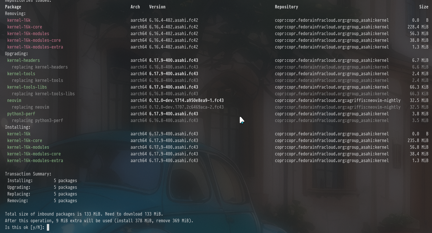 이제, sudo dnf update로 등록된 kernel 6.17.9 버전으로 업데이트할 수 있습니다. 공식 6.17 릴리즈와 비교해 보면, 대략 1달 정도의 지연이 있었네요.