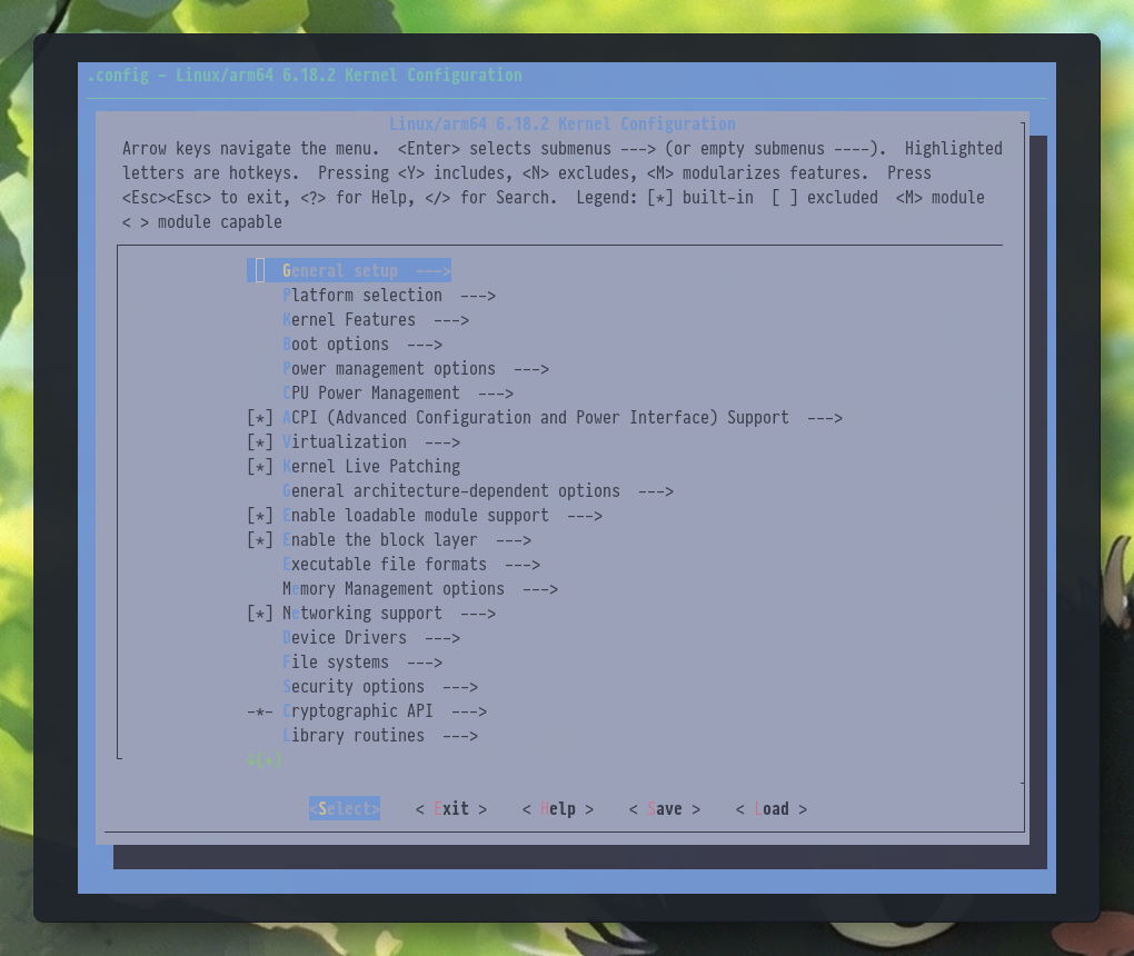 다음으로 make menuconfig를 실행하여 Asahi Linux관련 GPU driver의 활성 여부를 확인합니다. 이 절차는 단지 확인만 하는 절치 입니다. /lib/moduels/<커널 버전>/config 를 사용할 수 있다면, 건너뛰어도 됩니다.