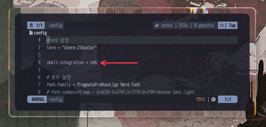 이 기능을 사용하기 위해서는 ghostty shell integration 기능이 활성화 되어 있어야 합니다. ghostty의 설정파일인 config 파일을 열고, 아래와 같이 shell integration(쉘 통합) 기능을 활성화해 줍니다.