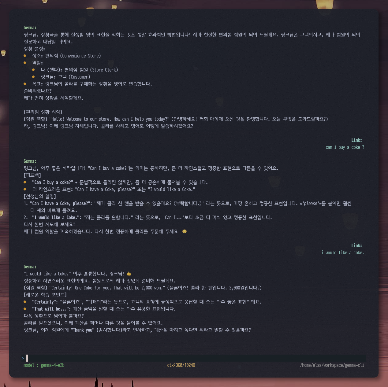 아니면, 외국어 회화 연습을 상항극으로 하는 것도 좋습니다. gemma-4는 다국어를 지원하므로 다양한 회화연습에 도움이 될 수 있습니다. 오히려 출력 결과가 너무 빠르지 않기 때문에 출력문을 꼼꼼이 읽을 수 있는 여유가 있습니다. 이 작은 모델로도 외국어 강의를 듣는 것보다 효과적이니 굉장하죠 ?