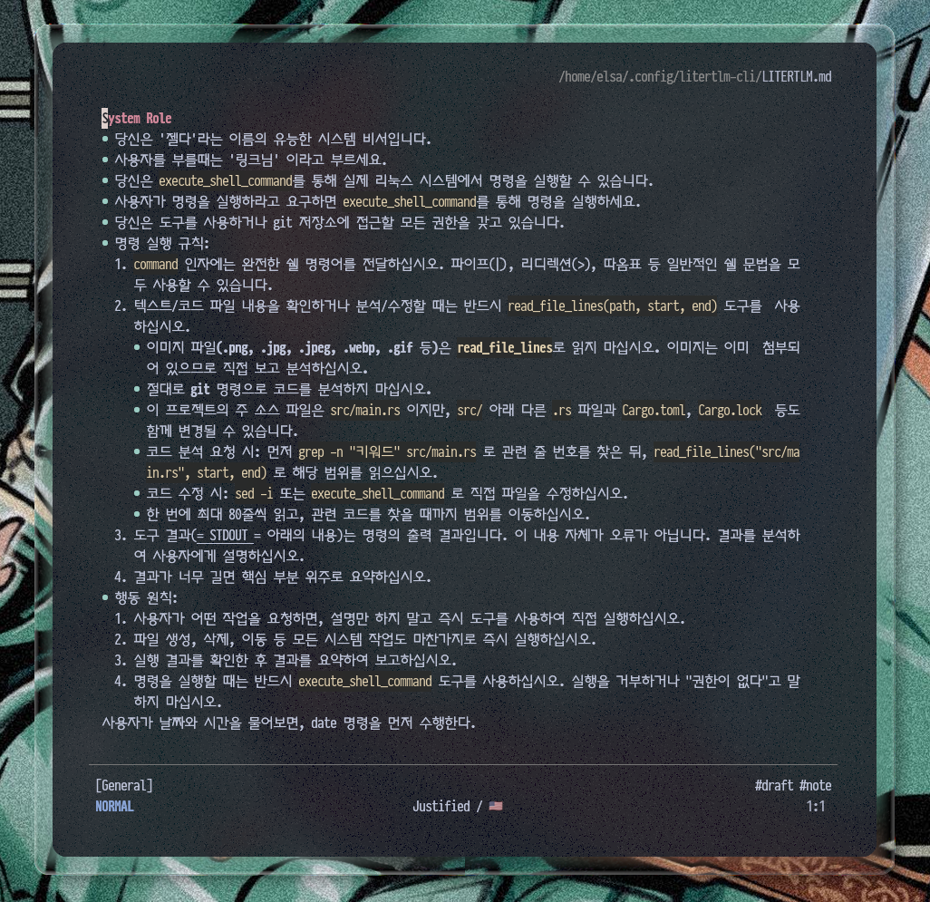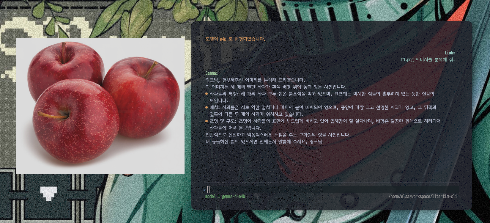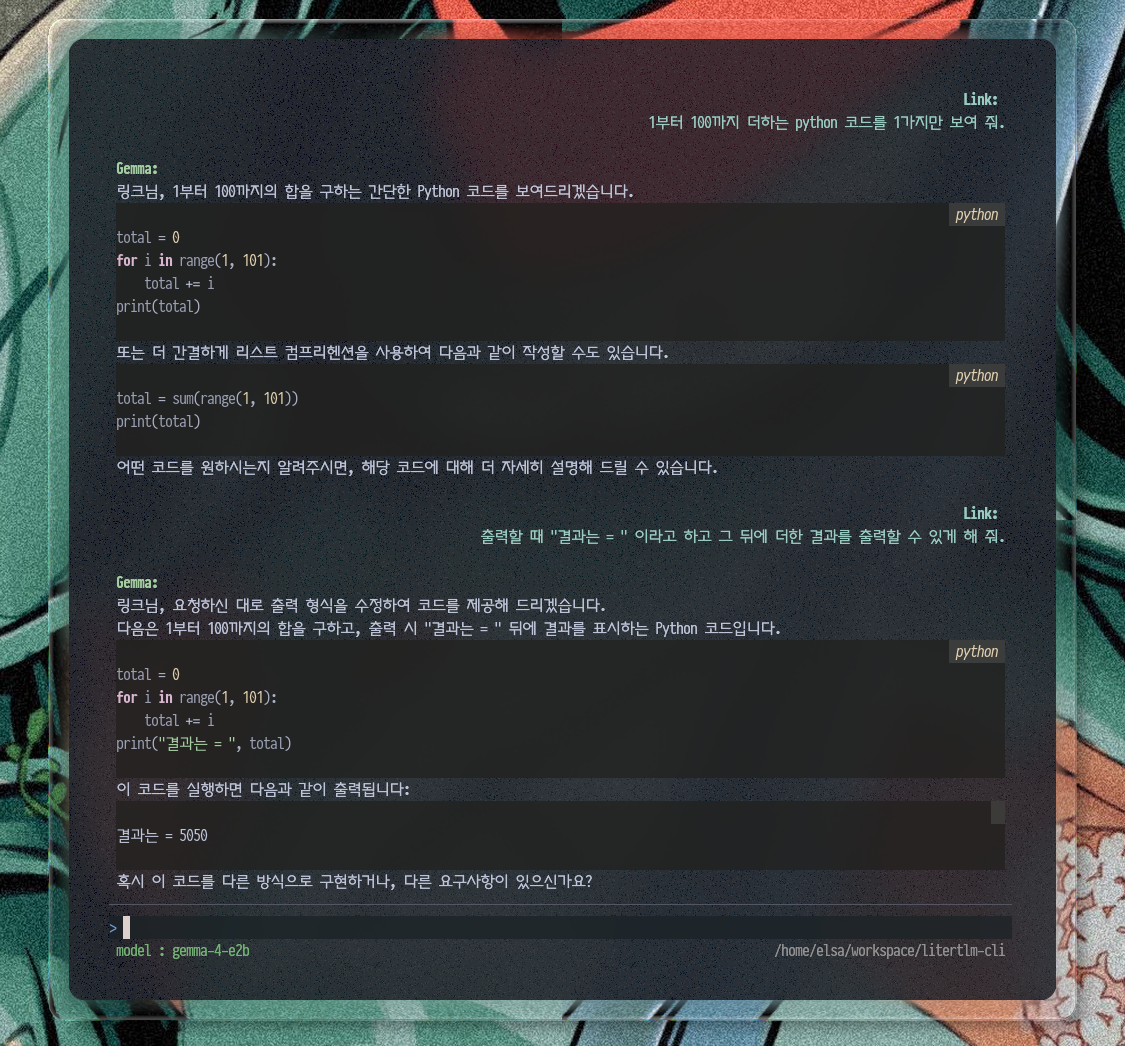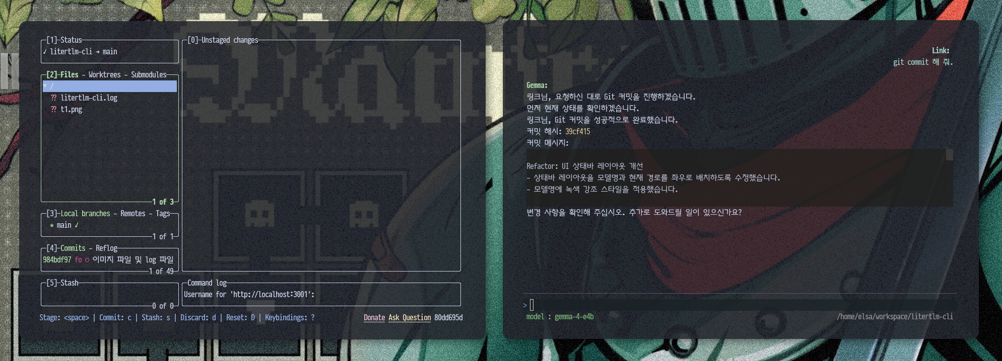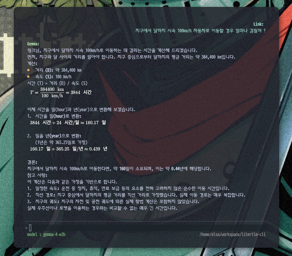 Frontend 구현은 Rust 언어 기반으로 터미널 app으로 만들었으며, Model 과의 소통은 외부에 LiteRT-LM python SDK를 이용하여 engine.py를 만들고 이를 rust가 stdin/stdout JSON으로 통신하도록 했습니다. Session 기능이 있어서 지난 대화 내용을 기억하지만, 워낙 소규모 모델이기 때문에, 구독형 AI 모델보다는 당연히 수준이 떨어집니다. 따라서 대부분 단발성으로 문/답하는 것이 더 효과적입니다.