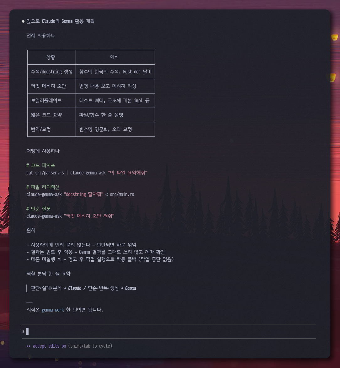 따라서, ~/.claude/CLAUDE.md 파일에 아래와 같이 Gemma 자동 위임 규칙을 아주 강하게 규정해야 합니다. 이것은 한 예 입니다.
