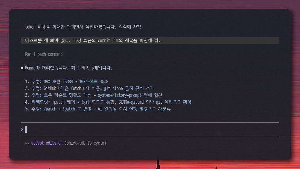 그래서 직접 Gemini-CLI, 나 Claude Code 같은 터미널 기반의 Gemma-CLI를 만들어 사용하고 있습니다. 적은 메모리와 CPU만으로 구동해야 하기 때문에 채팅 모드를 살짝 변형하여 사용합니다.