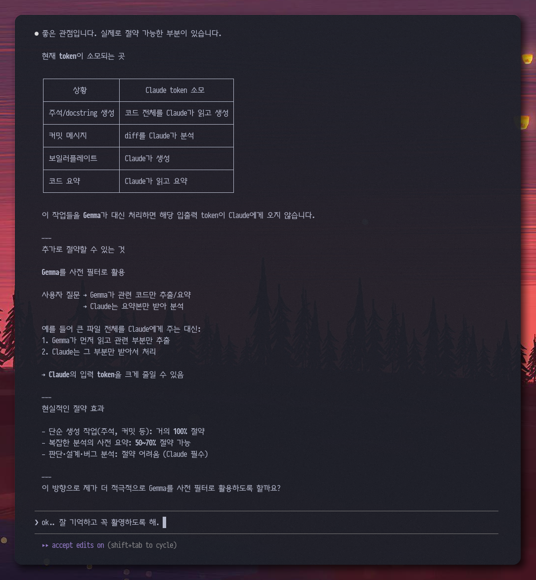 Claude의 Token 소모를 줄이기 위해 Gemma 를 사용하는 경우 Sub-Agent 로 설정을 하면 안됩니다. Claude Code 의 Agent 툴로 Sub-Agent를 생성하면, 에이전트가 tools:Bash만 가지더라도 그 에이전트를 구동하는 Claude 모델 인스턴스가 내부적으로 만들어지는데, 이 때, 시스템 프롬프트, CLAUDE.md, Memory.md 등이 그 인스턴스에 로드되므로 Token 소모량이 오히려 늘어 날 수 있습니다. 따라서, Token 소모를 최소화(거의 0)로 만들려면 Claude가 직접 Bash로 claude-gemma-ask 라는 도구를 호출하고 이를 통해 gemma 에게 요청을 하도록 해야 합니다. 그리고, 그 응답을 받아서 화면에 표시하도록 해야 하는 것이죠.