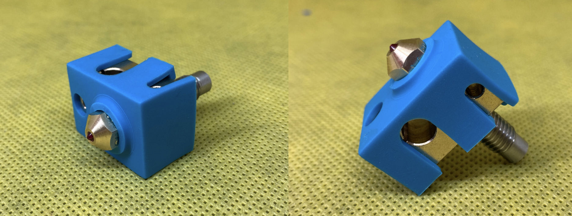 하지만, 제 3D 프린터는 Titan Aero를 사용하고 있고, 기존에 E3D V6 Type의 노즐을 사용하고 있었기 때문에, E3D Heat Block, Heatbreak와 MK8 Nozzle의 조합이 적절하지는 않습니다 만, 그렇다고 전혀 몹쓸 조합은 아닙니다. 이유는 MK8용 부품이 당장 없어서 이기는 한데, E3D Heater Block에 Heatbreak와 MK8 노즐을 연결 시, 노즐 팁이 Heater Block의 바닥면에 완전히 밀착하는 정점이 있는 반면, Heatbreak가 Heater Block 안으로 대략 1.5mm 정도 더 들어가는 단점이 있습니다.