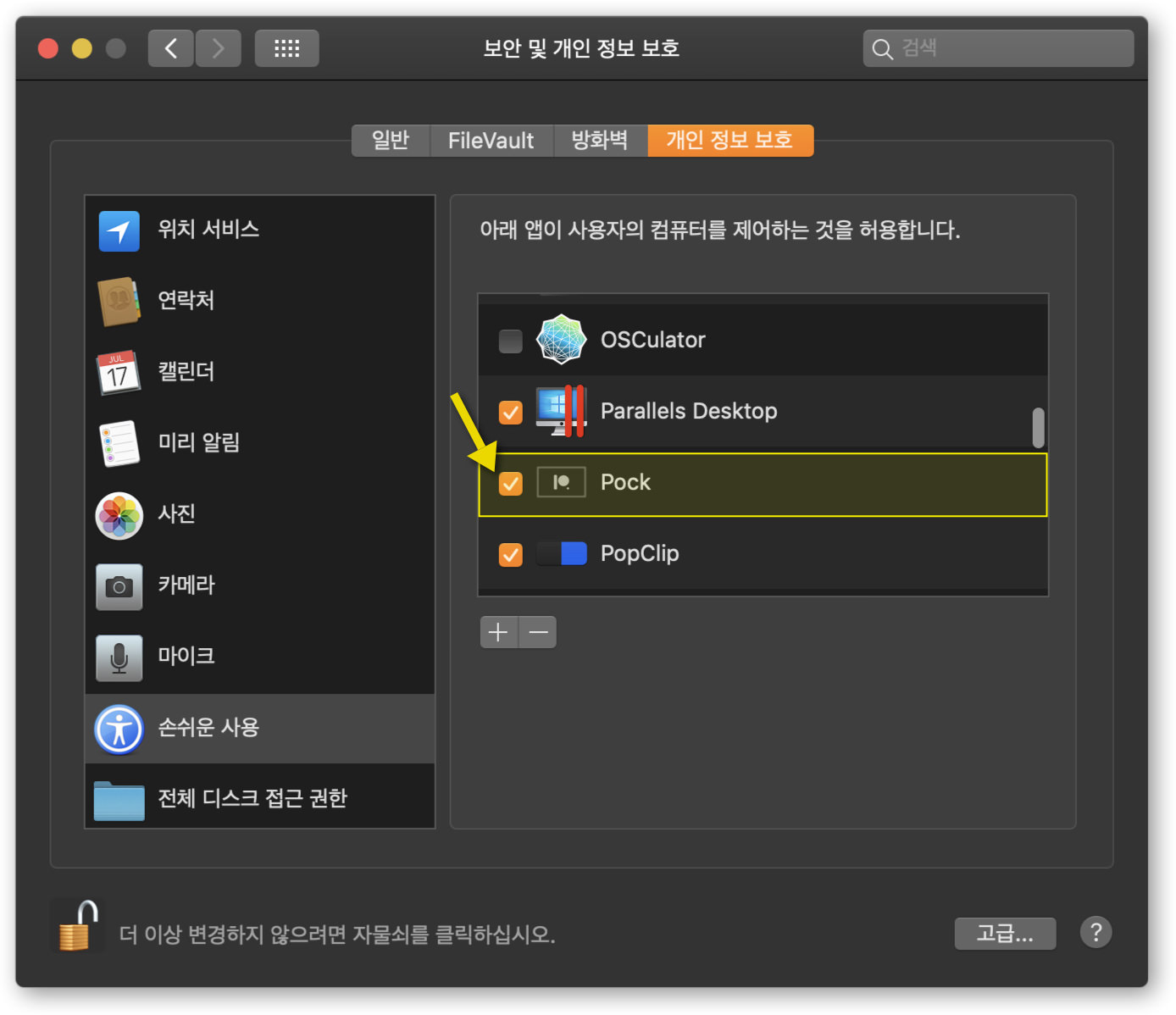 우선 Pock을 설치 및 실행하면 "손쉬운 사용"에 대한 사용자 인증을 요구 합니다. 아래와 같이 Pock이 컴퓨터를 제어하도록 설정을 해 주면 됩니다.