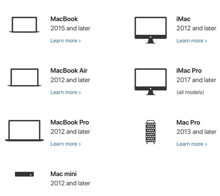 우선, macOS 10.15 Catalina를 사용할 수 있는 Mac 사양은 아래와 같이 최소 2012년 이 후에 나온 모델들이 그 대상임을 알 수 있습니다.
