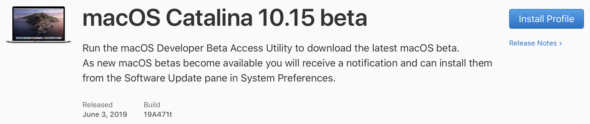 macOS 10.15 Catalina의 첫번째 베타 버전의 빌드넘버는 19A471t 입니다.