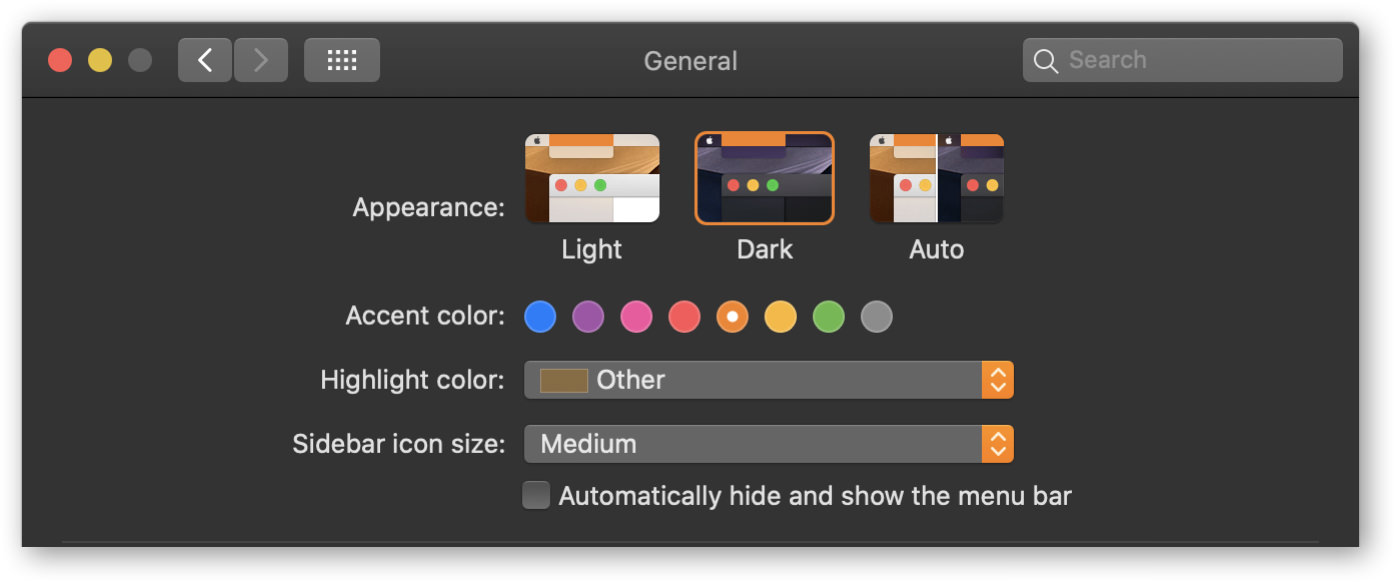 일반 아이콘을 누르면 아래와 같이 화면 모드가 Light/Dark/Auto 3개로 변경된 것을 볼 수 있습니다. 그 밖의 항목들은 예전과 동일 합니다.