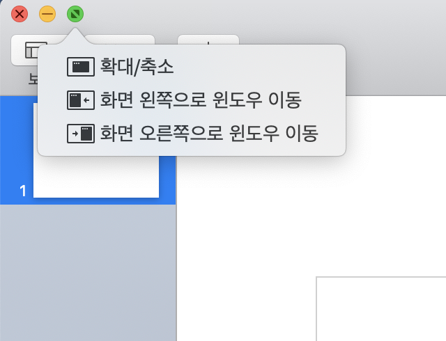 다음 WIndows 전체 기능에 해당되는 것으로 WIndow이 녹색버튼(최대화)에 마우스 커서를 갖다 대고 잠시 대기하면 아래와 같이 전체 화면 모드와 SplitView 모드로 배치 할 수 있는 창이 뜨게 됩니다. 아래 창에서 타일 윈도우라는 것이 SplitView 모드를 의미 합니다.