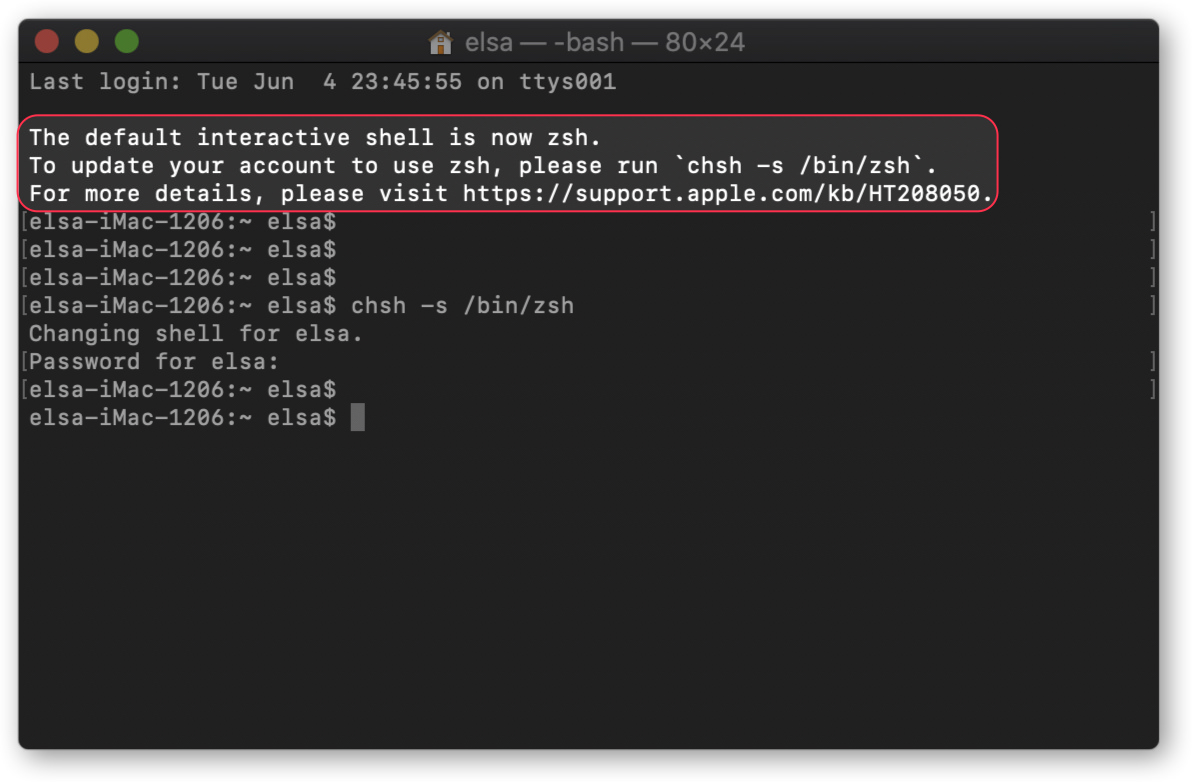 일단 실행은 bash로 실행이 되며, 기본 shell이 zsh라고 표시가 됩니다. 변경하는 방법도 안내가 되어 있wy. chsh -s /bin/zsh 명령을 내리면 됩니다. 해당 명령을 내린 후, 관리자 패스워드를 입력하고, 터미널을 종료 한 후, 다시 실행하면 아래와 같이 zsh로 쉘이 열리게 됩니다.