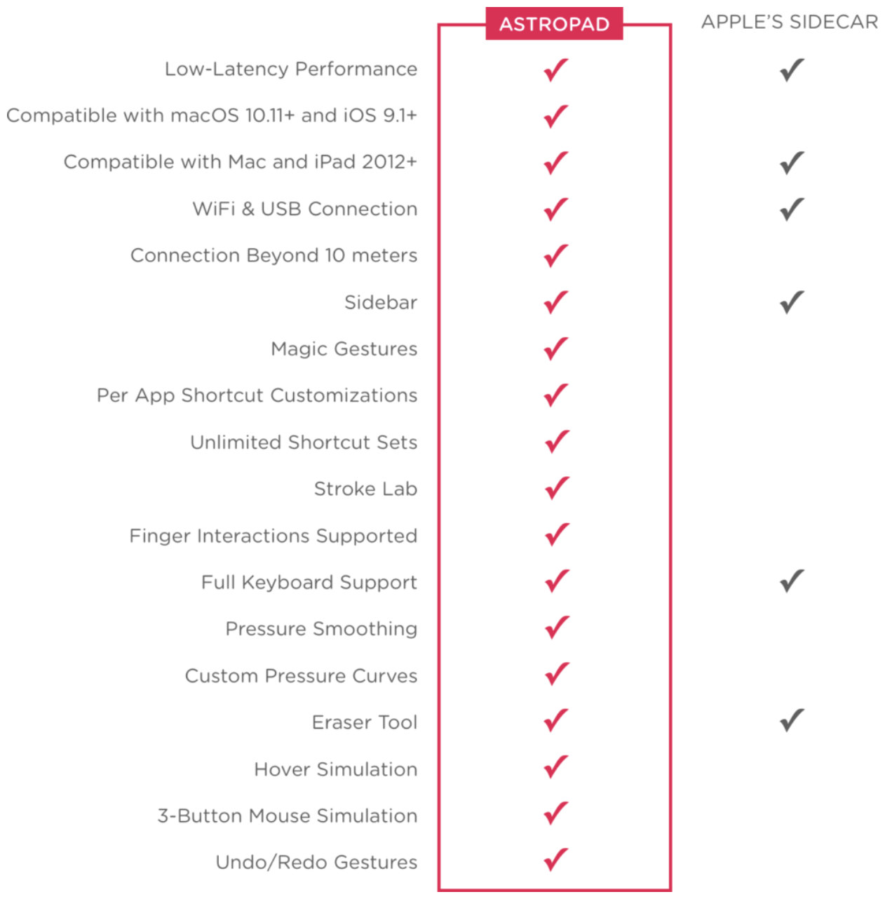 Astropad는 Blog를 통해, Astropad와 Apple의 Sidecar 기능 및 성능을 비교하는 테이블을 제시하면서, 자사이 솔루션이 애플의 sidecar 보다 월등하다는 것을 제시합니다.