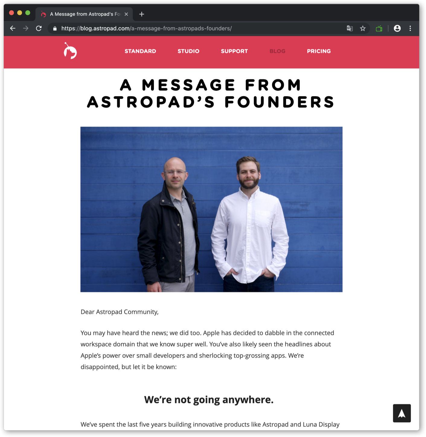 Astropad 입장에서는 이번 애플의 Sidecar 기능 발표가 반가울리가 없습니다. Astropad는 즉각 "Astroapad 설립자의 메시지"라는 글을 자사의 Blog에 게재 했습니다. 하지만 긍정적으로 생각을 해 보면, 자신들의 솔루션을 광고할 절호의 타이밍을 잡은 것일 수도 있습니다.