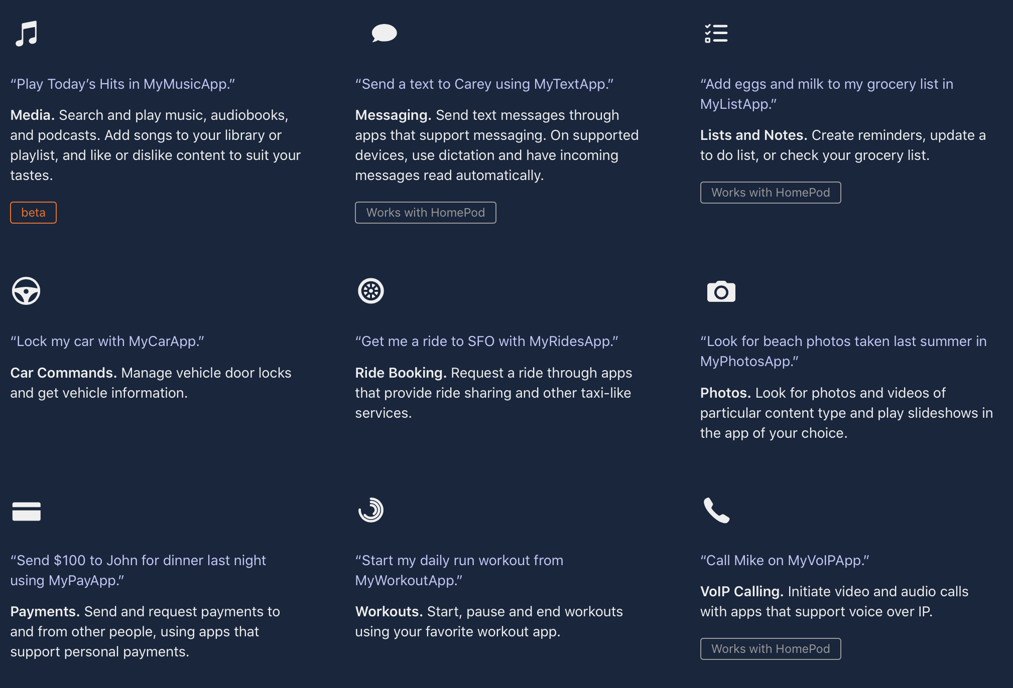 개발자 홈페이지에 나온 Sirikit 소개 페이지를 보면, 위와 같이 Siri를 통해 Spotify와 같은 3rd-party 음악 앱이나, 택스트, 운동, 맵, 페이, VoIP 서비스 앱들을 사용할 수 있음을 알 수 있습니다.