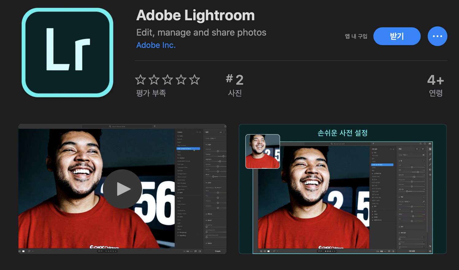 Mac App Store에 올라온 Lightroom은 클라우드 스토라지 1TB 옵션을 가진 정기구독 버전으로, 1개월에 1만 2천원의 사용료를 지불하거나 1년에 15만 5천원을 지불해야 합니다. 다운로드는 무료이며, 1주일간은 무료로 사용할 수 있으며, 7일이 지나면 "자동으로" 월별 결제 모드로 전환된다는 점은 주의해야 하며, 최소 하루 전에는 계정설정에서 자동 갱신을 꺼야 합니다.