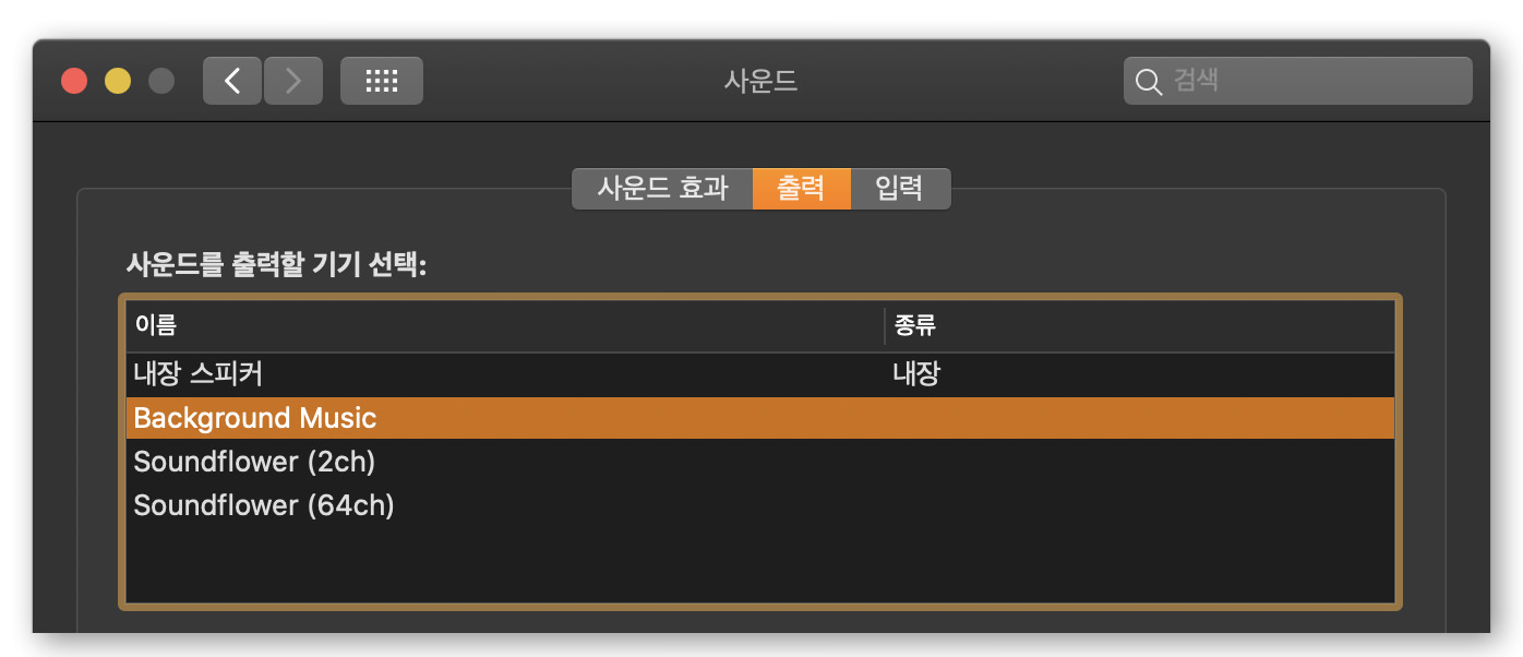 만약 설치 후에, 볼륨 조절이 되지 않는다면, 아래와 같이 "시스템 환경설정" > "사운드" > "출력"이 Background Music으로 설정되어 있는지 확인하시기 바랍니다. "Background Music"으로 설정이 되어 있어야 합니다.
