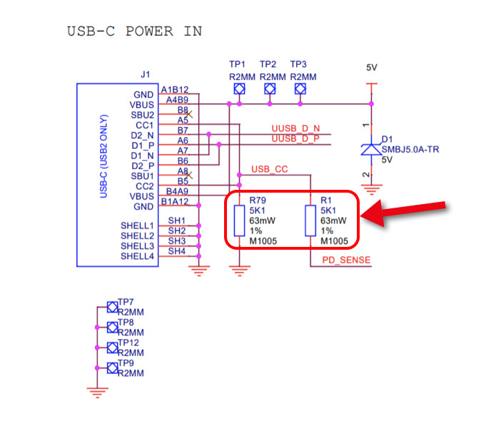 CC1과 CC2가 각각 독립적인 5.1K 저항을 가져야 하지만, 위에 보는 바와 같이 두 저항이 연결되어 있는 것을 확인할 수 있습니다.