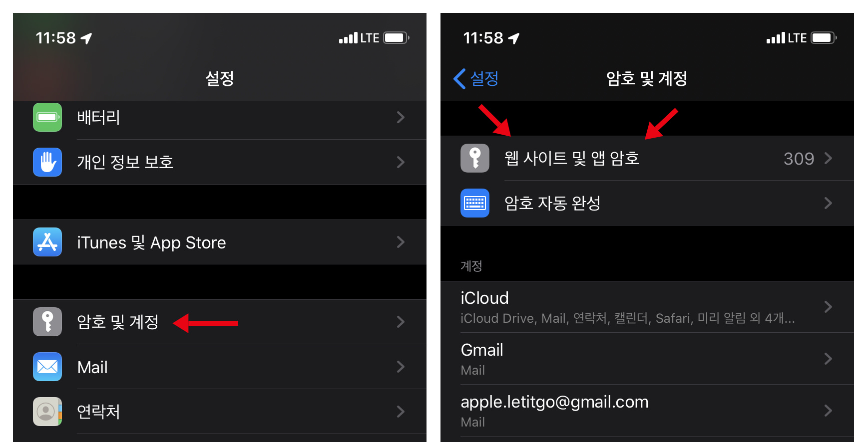 iOS는 Safari와 연동되는 앱 사이트와 그에 관련된 계정과 암호가 저장되어 있으며, 사용자는 "설정" -> "암호 및 계정" -> "웹 사이트 및 앱 암호" 에서 확인을 할 수 있습니다.
