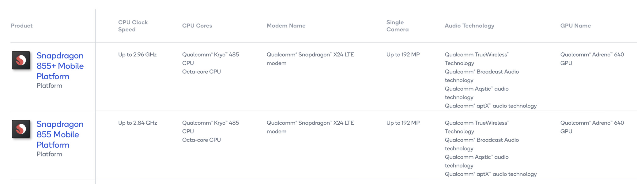 Kyro 485 CPU와 Adreno 640 GPU, LTE를 지원하는 X24 모뎀등 구성은 동일하며, CPU의 동작클럭은 2.84GHz에서 2.96Hz로 높혔으며, GPU 역시 672MHz로 상향 렌더링 속도는 15% 향상되었습니다. 5G를 사용하려면 기존 855와 동일하게 별도의 X50 모뎀을 구성해야 합니다.