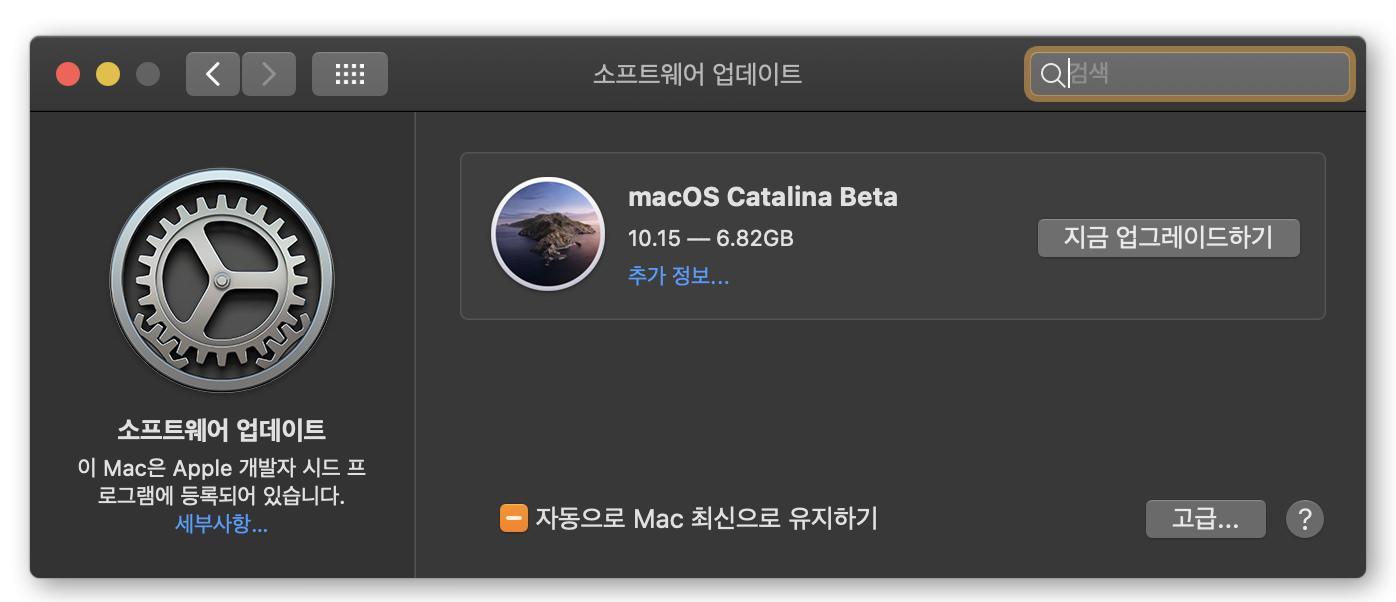 애플은 오늘 macOS Catalina 10.15 Beta 4 개발자 버전(빌드넘버 : 19A512f)을 공개 했습니다. 용량은 대략 6.8GB 이지만 업그레이드를 하려면 10GB 이상의 여유 공간이 필요 합니다.