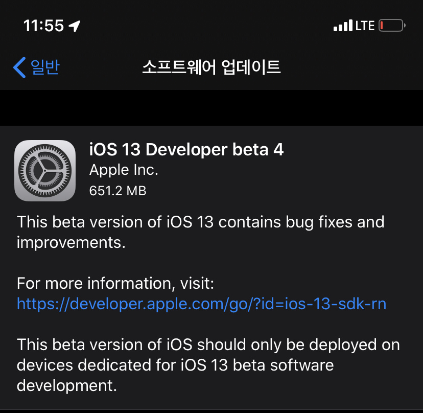 애플은 오늘 iOS 13 beta 4 (빌드넘버 : 17A5534f) 개발자 버전을 릴리즈 했습니다. 기존 개발자 Beta 버전 사용자 분들은 OTA로 업데이트를 하실 수 있으며, 공개 베타 사용자 분들은 몇일 더 기다려 봐야 할 듯 합니다.