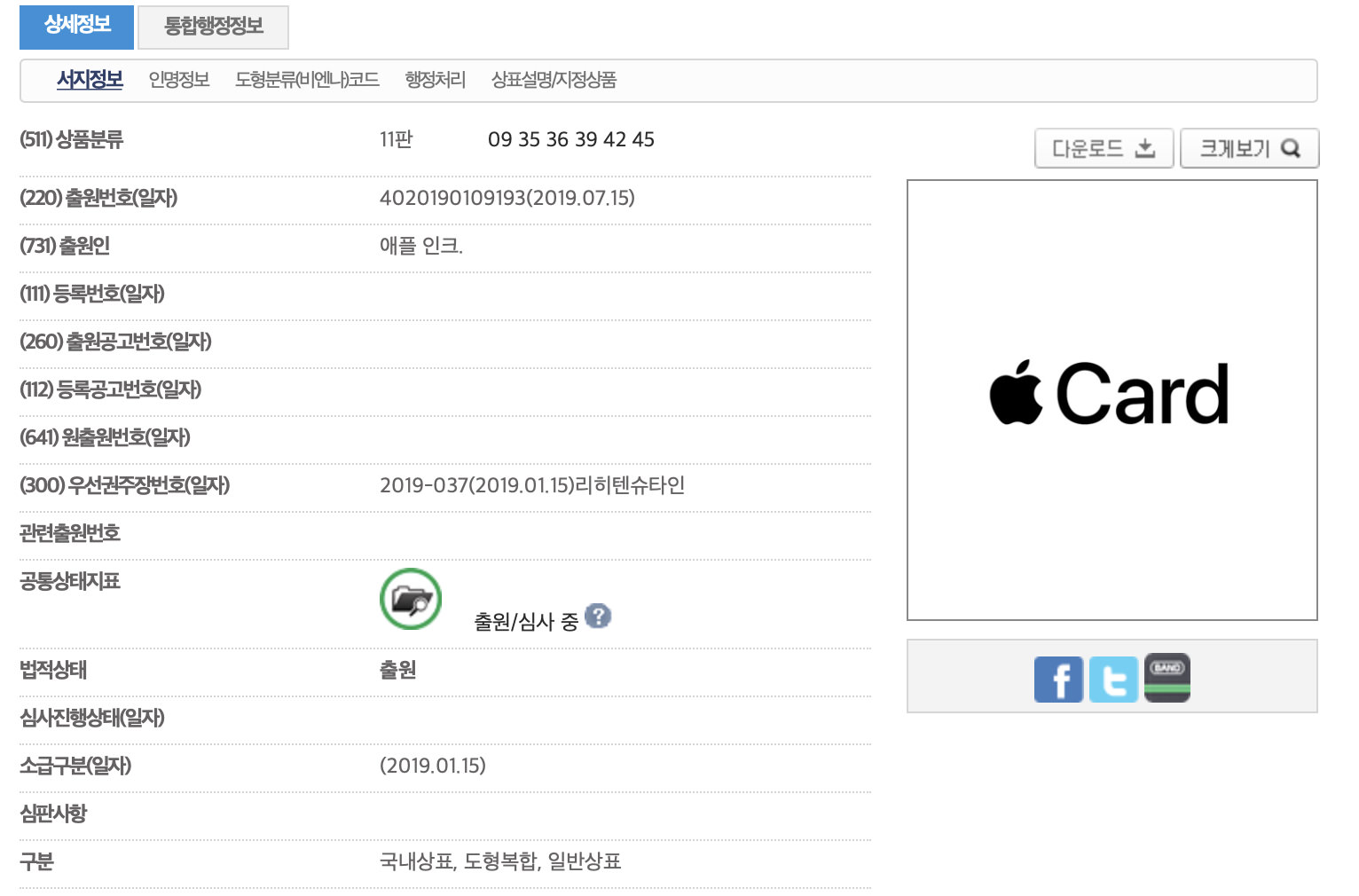 애플이 지난 7월 22일한 국 특허청에 Apple Card에 대한 상표 출원을 올리고, 현재 심사 중에 있습니다.