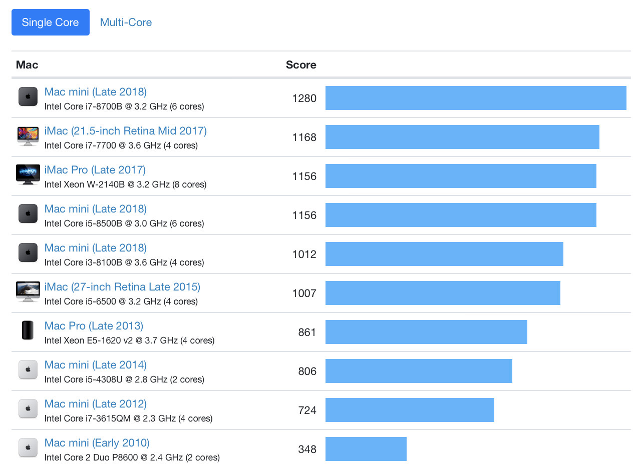 아래는 geekbench 5 beta로 측정한 Mac benchmarks 차트 입니다. Mac mini (Late 2018)의 Score가 인상적이네요.. ^^