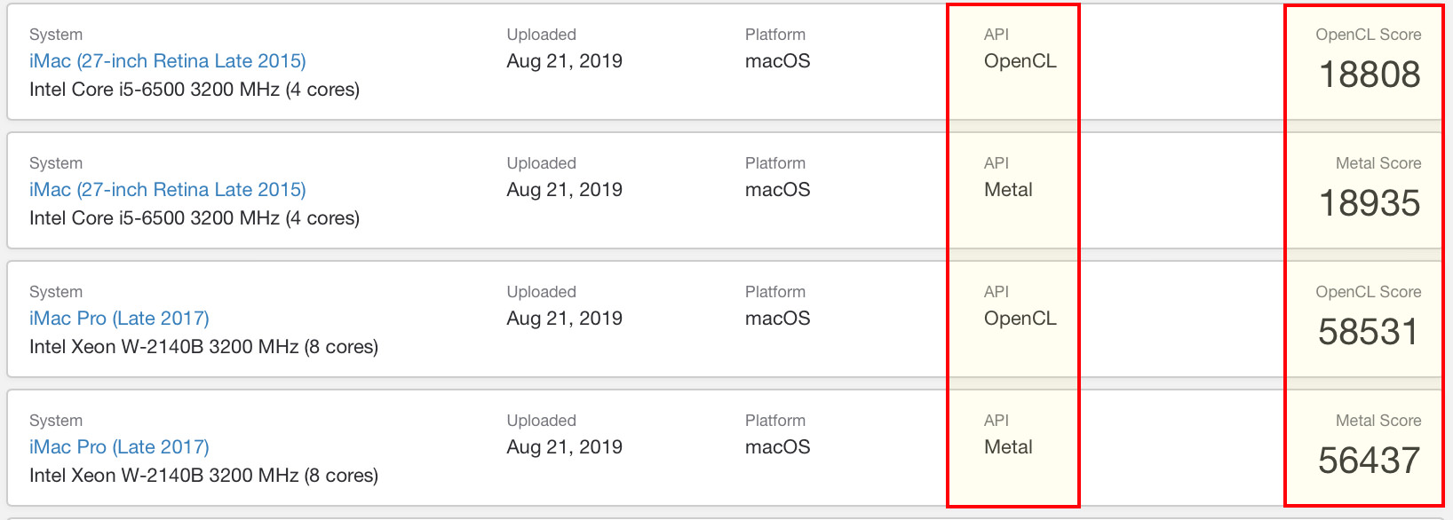 GPU 기본 성능측정 API는 OpenCL이며, 차세대 크로스 플렛폼 3D그래픽 및 컴퓨팅 API인 Metal(Vulkan)의 경우에는 정식 등록을 해야 측정할 수 있습니다. macOS Metal의 경우에는 아직 최적화가 되어 있지 않아, 측정결과를 보면 OpenCL과 대등소이하거나 오히려 OpenCL이 높게 나오는 것을 알 수 있습니다.