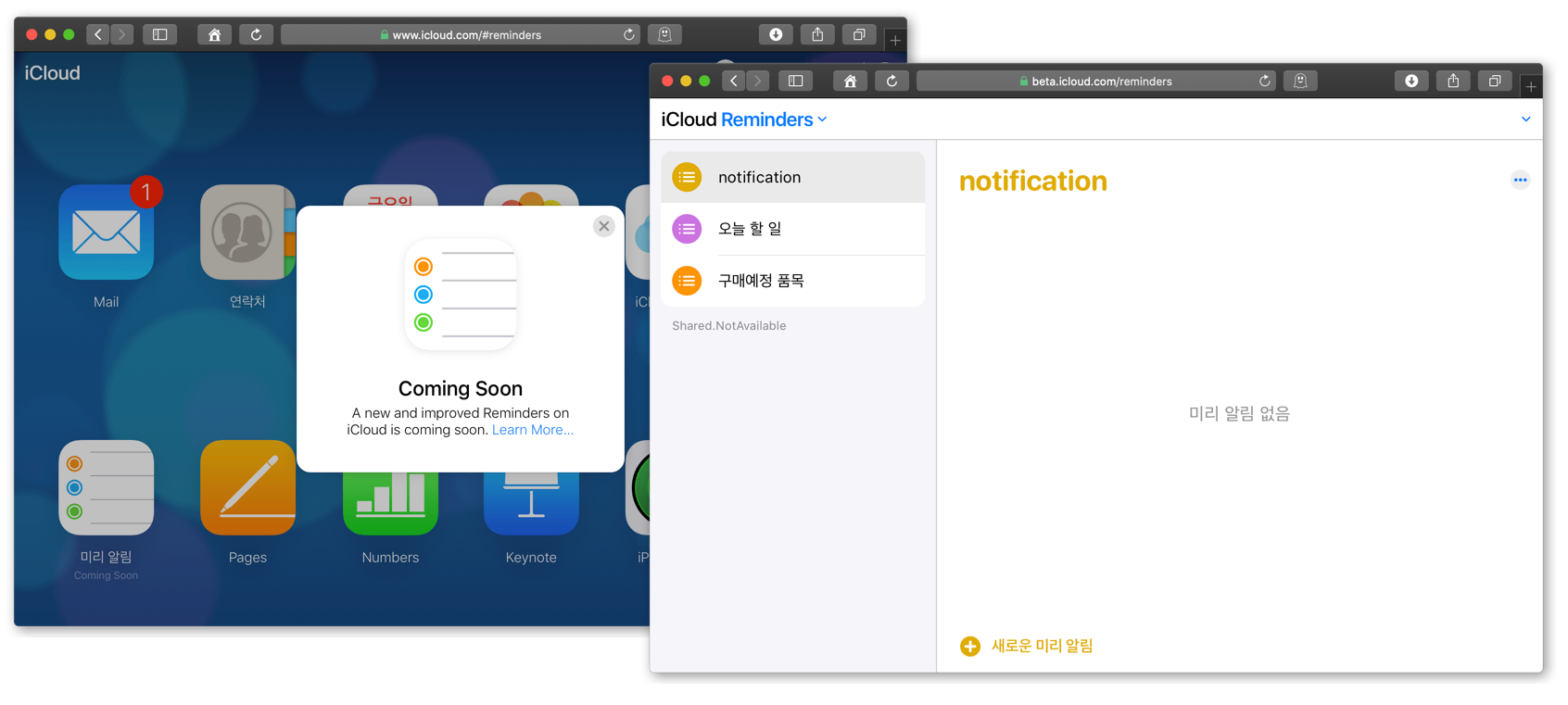 현재 iCloud.com에서는 미리알림(Reminders) 앱이 업데이트 중이라며 실행이 안되지만, beta.icloud.com 에서는 실행이 됩니다.