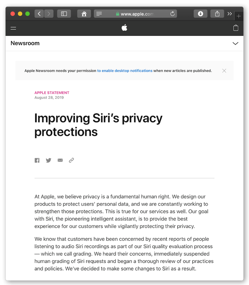 보도자료에 따르면 애플은 최근 발생한 Siri 평가 행위를 즉각 중지, Siri와 관련된 정책을 일부 변경하기로 결정한다고 합니다.