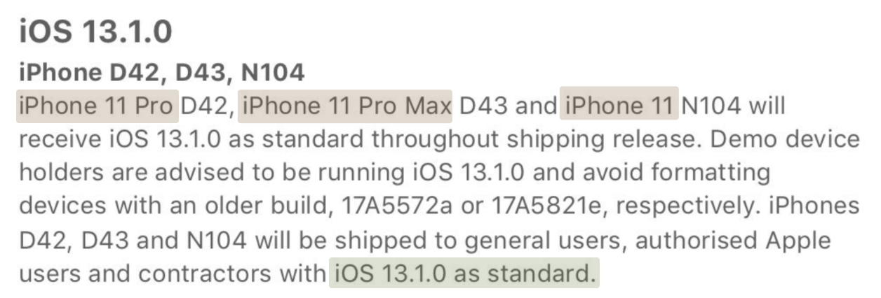 차기 아이폰은 아래 보는 바와 같이 iPhone 11, iPhone 11 Pro, iPhone 11 Pro Max 라고 되어 있습니다. 이는 각각 iPhone XR, XS, XS Max의 차기제품으로 보면 될 것 같고, 이미 루머로 돌고 있던 내용과 일치 합니다. iOS 13 이 아닌, iOS 13.1.0이 기본적으로 탑재되어 제공될 것이라는 점도 눈에 띄는 대목입니다.