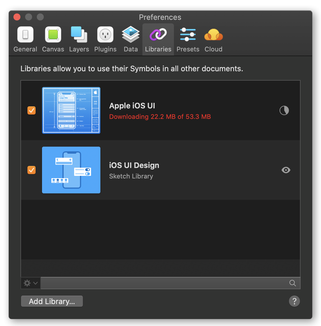 Sketch App을 사용하시는 사용자 분들 중에 iOS 관련된 앱 개발 혹은 아이폰 관련 디지인에 필요한 분들은 검토해 보시기 바랍니다. 위에 보시면 2개의 다운로드 링크가 있는데, 둘은 동일한 리소스 입니다. 다만, 위의 Add iOS Sketch Library 링크를 클릭하면, 설치된 Sketch 앱이 실행되면서, 아래와 같이 Library에 자동으로 다운로드가 됩니다. 그냥 별도로 설치 Package를 다운로드 받으려면, 두 번째 다운로드 링크를 이용하면 됩니다.