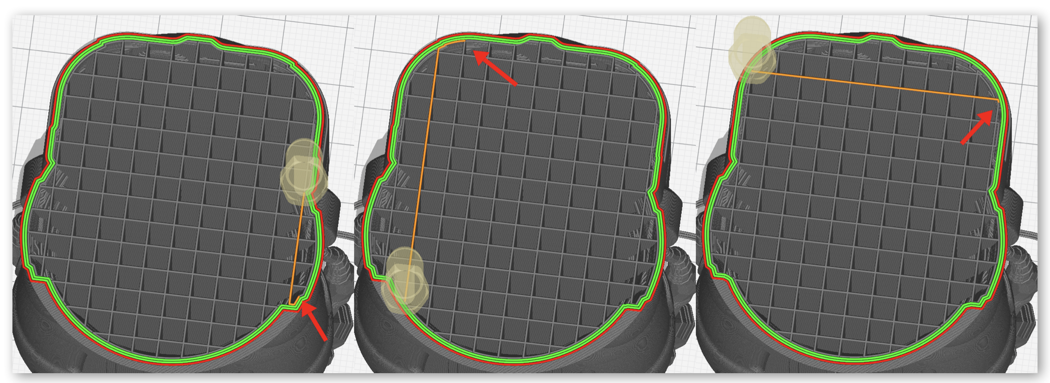 Radomize Infill Start 옵션은 이와 같이 특정 세그먼트에서 Infill이 반복적으로 시작되는 것을 방지, 무작위 시작점에서 Infill을 출력하도록 해 줍니다. 아래의 예는 연속된 3 레이어의 Infill 시작점을 보여 줍니다.
