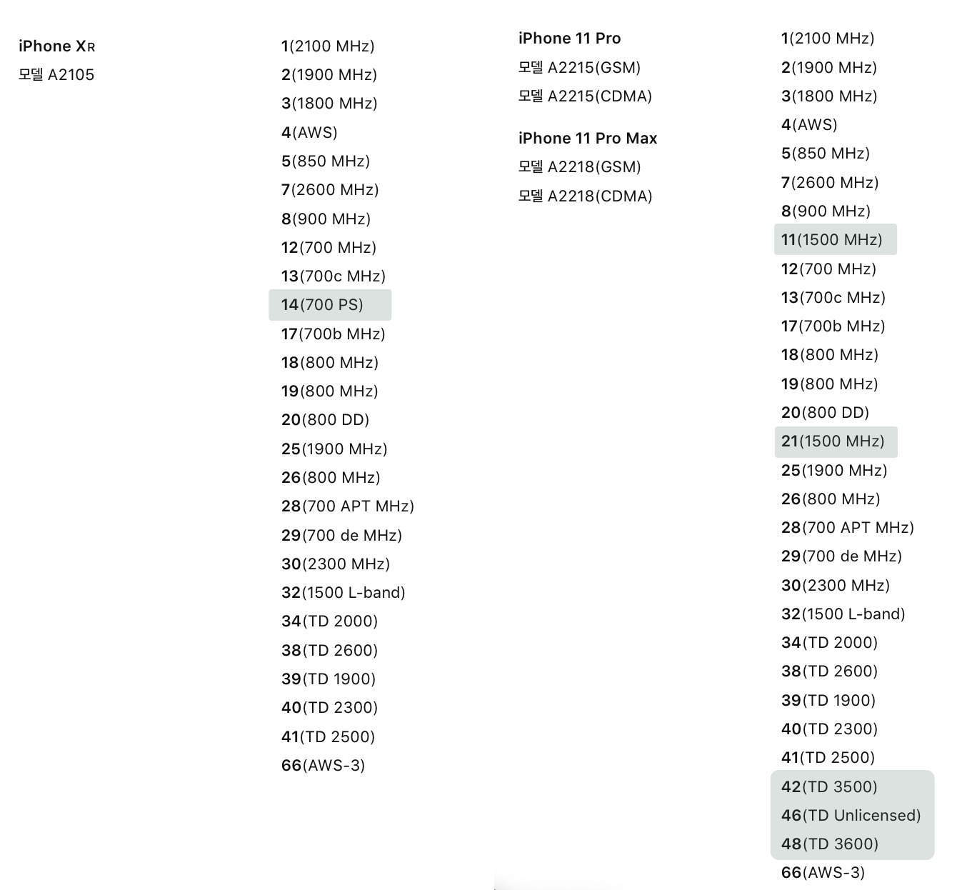 국내에 출시되는 Pro/Pro Max 모델은 LTE 대역을 1번 ~ 66번까지 사용하는 것으로 표시가 되어 있습니다. 즉, 위에 제시한 미국이나 중국/홍콩과는 다르지만, 위에 제시한 기타 국가들의 iPhone 11 Pro/Pro Max의 주파수 대역과는 일치 합니다.
