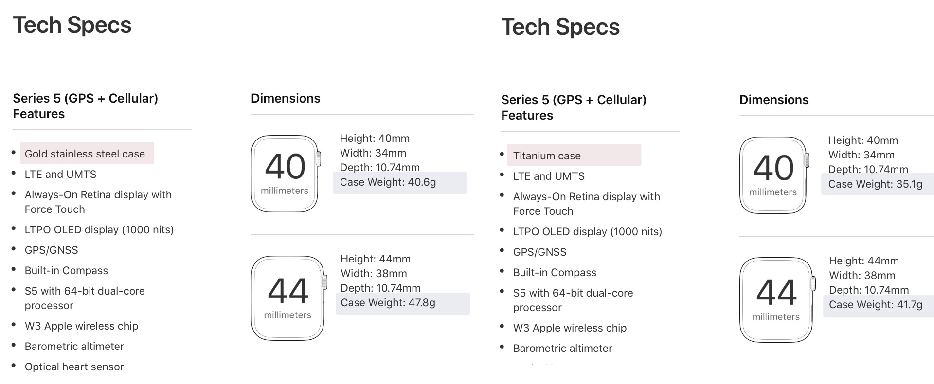 아직 국내 공홈에는 예약을 할 수 없어서, 자세한 Spec을 볼 수 없습니다 만, 미국 공홈에는 예약판매 페이지의 Spec 정보를 통해 스테인레스 케이스와 티타늄 케이스의 자세한 정보를 볼 수 있습니다. 아래는 애플 워치 5의 스테인레스 케이스와 티타늄 케이스의 무게를 비교한 것입니다.