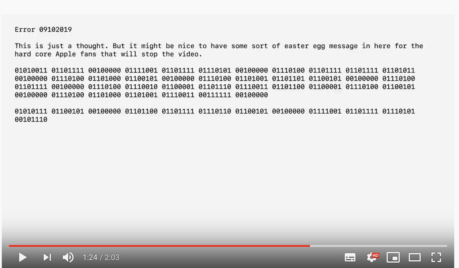 이것은 단지 생각입니다. 비디오 플레이를 멈출 열성 애플 팬들을 위해 여기에 일종의 이스터 에그 메시지가있는 것이 좋을 것 같습니다.