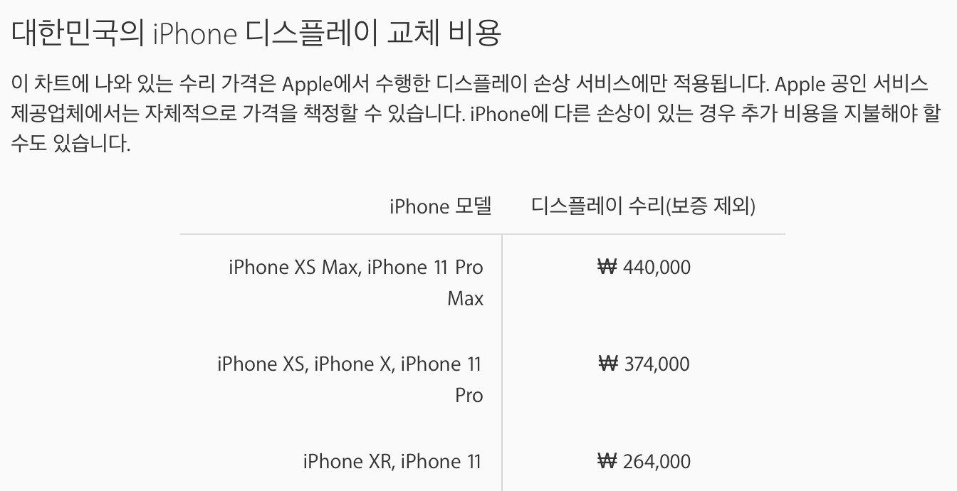 관련하여, 아이폰 11 라인업의 디스플레이 교체 비용(보증 제외)은 이전 세대인 아이폰 XR, XS, XS Max와 동일하게 책정되어 있으며, 아래와 같습니다.