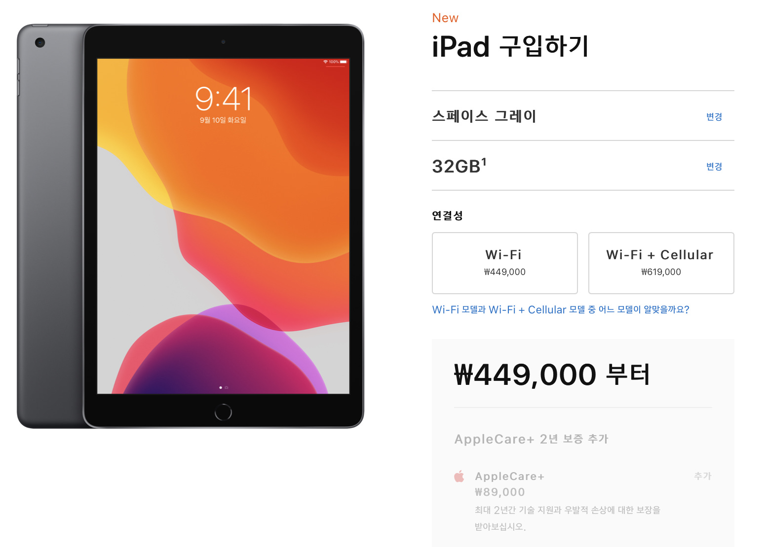 엔트리 모델인 Wi-Fi 32GB 모델 가격은 위에 보시는 바와 같이 44만 9천원 이며, 2년 보증 AppleCare+를 추가할 경우 8만9천원이 추가 됩니다. 셀룰러 모델은 61만 9천원