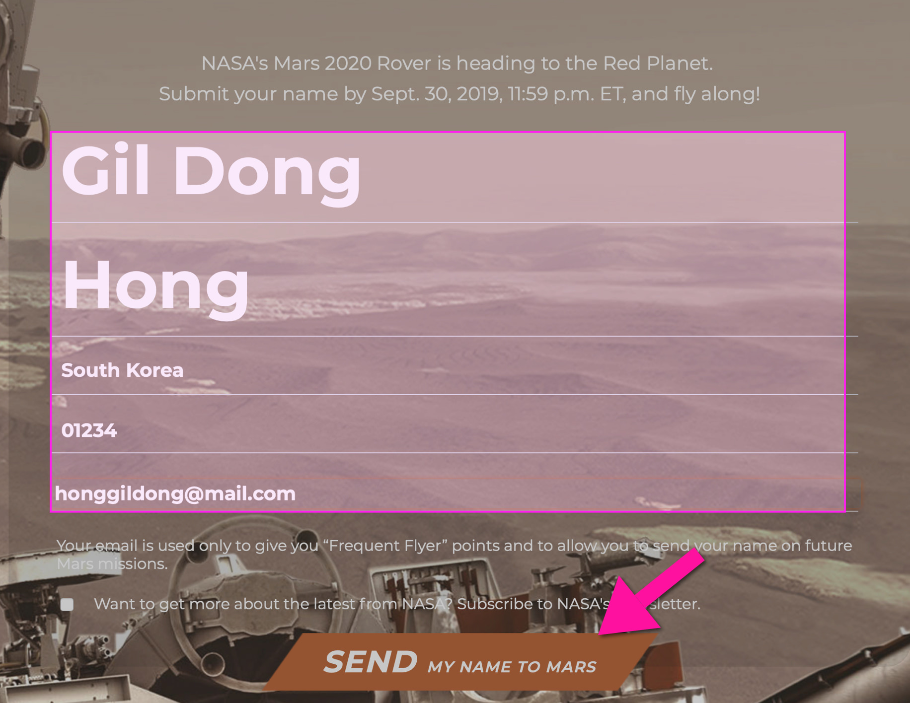 참여하는 방법은 간단합니다. 홈페이지를 방문한 후, 아래와 같이 이름과 국적, 그리고 우편번호, 이메일 주소를 기입한 후, "SEND my name to mars" 버튼을 클릭하면 됩니다.