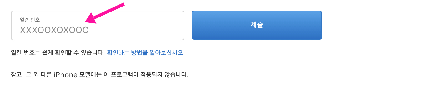 이 문제는 아이폰 내부 구성요소의 문제가 원인이 되어 발생하는 것으로, 2018년 10월부터 2019년 8월 사이에 제조된 특정 일련 번호 범위 내의 기기에서만 발생한다고 밝히고 있습니다. 위의 기간 동안에 제조된 아이폰 6s/아이폰 6s plus를 구매한 사용자들은 문제의 발생여부와 관계없이 위의 링크를 타고 들어가신 후, 아래와 같이 자신의 아이폰 일련번호를 넣고 조회를 하여 무상 수리 프로그램 대싱여부를 확인해 보셔야 합니다.