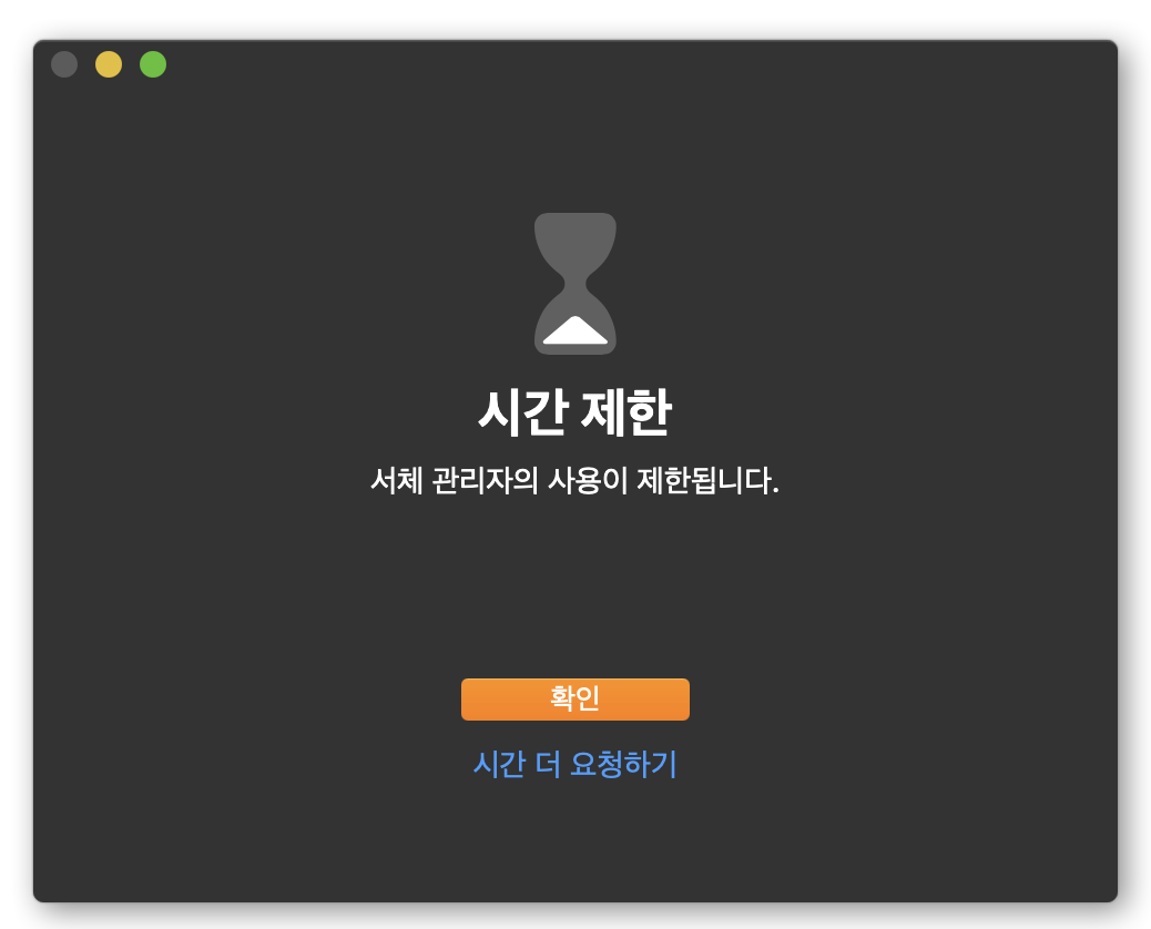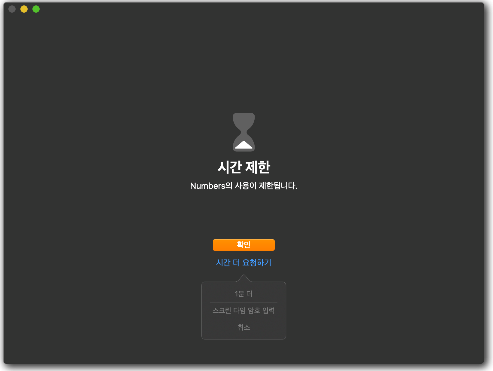 다운타임에서 컴퓨터 사용 시간을 설정하면, 다운타임 시작시각 부터 종료시각까지는 기본적으로 mac에서 사용할 수 있는 모든 앱의 윈도우 화면이 아래와 같이 꺼지게 되어 해당 앱을 사용할 수 없게 됩니다.